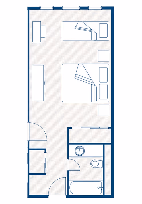 Ideal for singles or couples looking for a cozy home base. It features a kitchenette, two queen-size beds or one king-size bed, and is still spacious enough to stretch out and enjoy the time spent in your room.